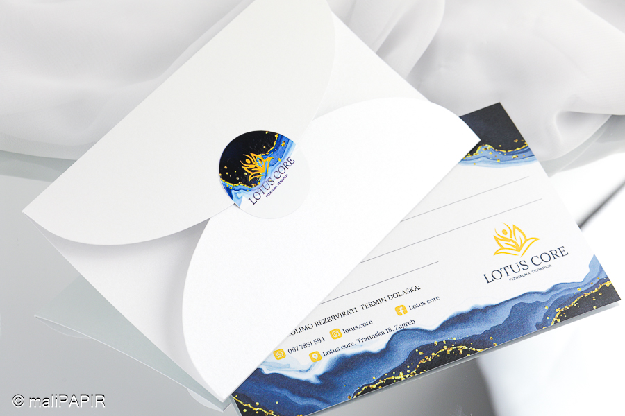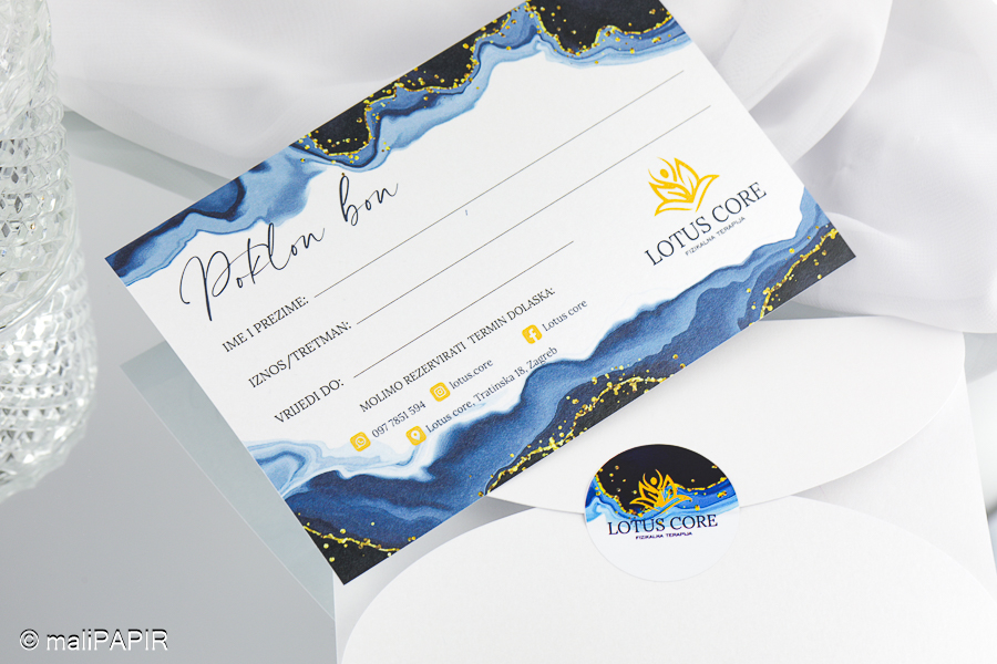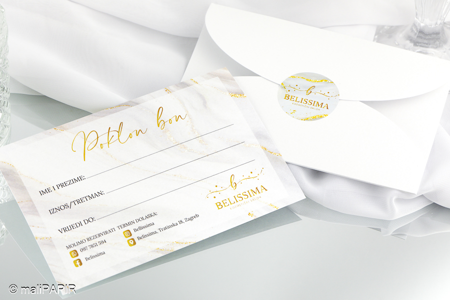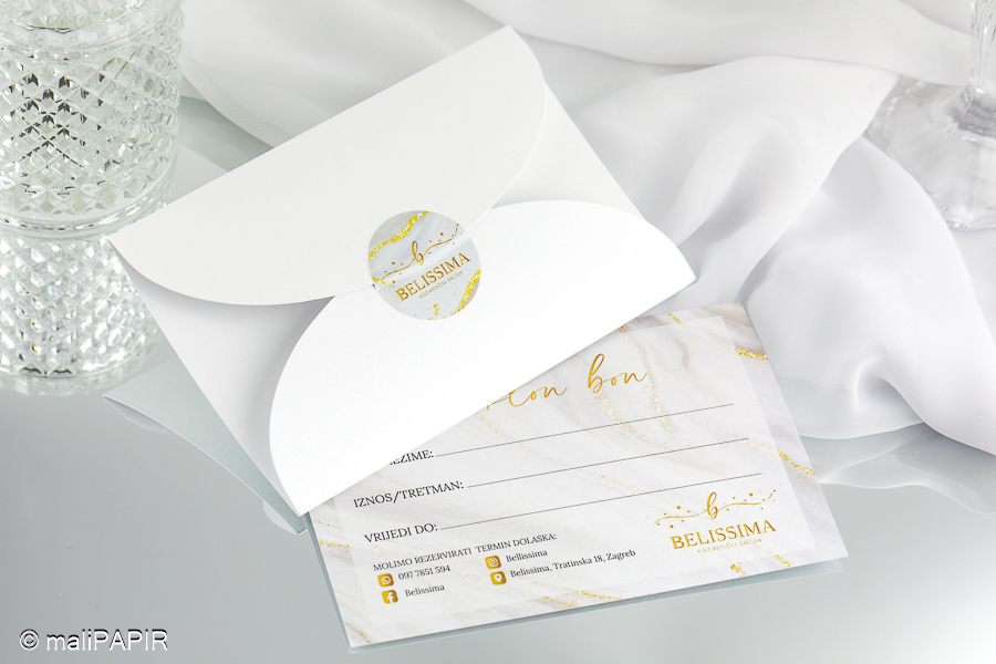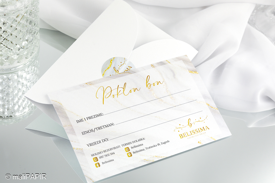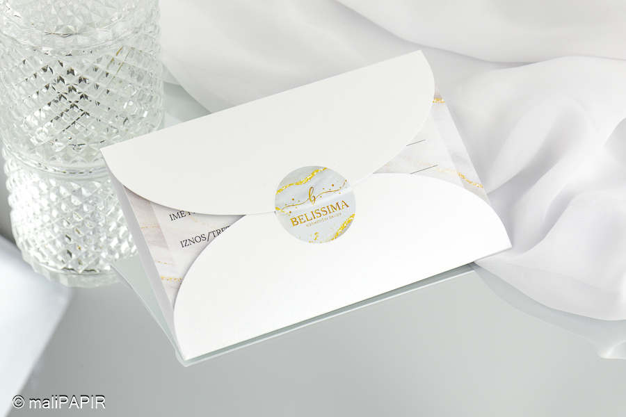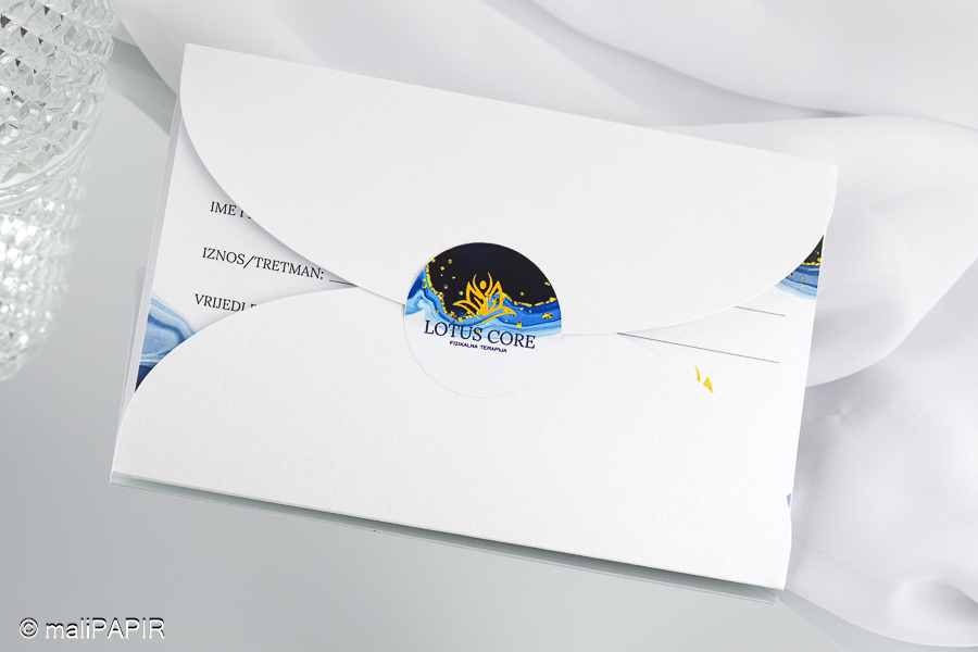 Poklon bon u zaobljenom poluotvorenom omotu, ukrašen je naljepnicom s prednje strane.