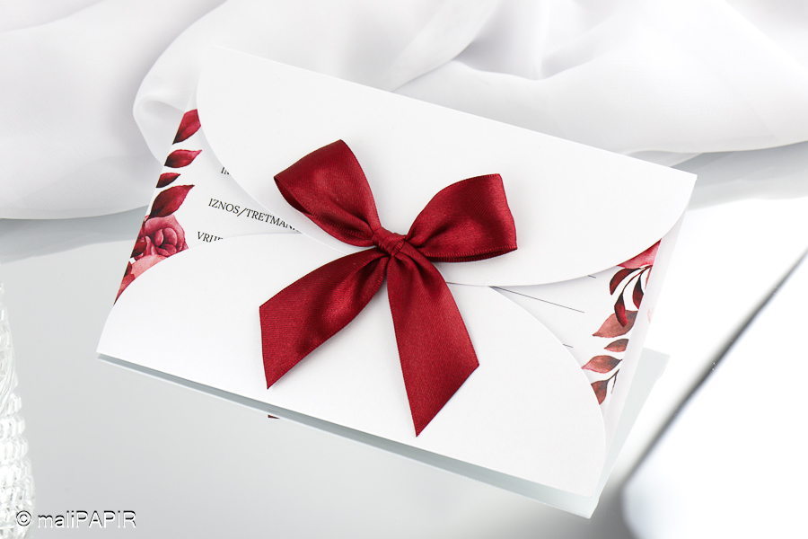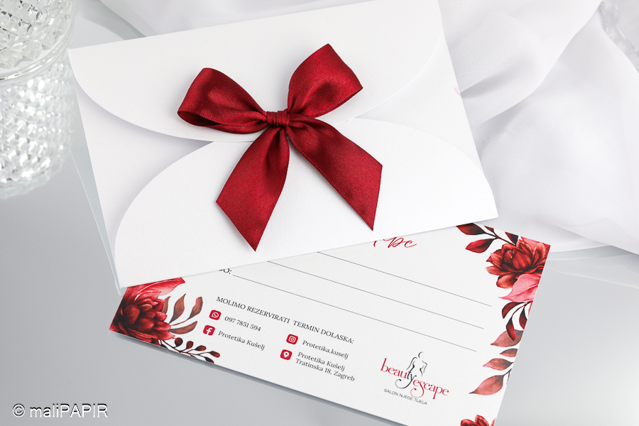 Izrađen je u preklopljenog omota zaobljenih strana u koji se umeće kartica s tekstom. Dodatno je ukrašen satenskom mašnom. Tisak se nalazi na kartici (jednostrano).