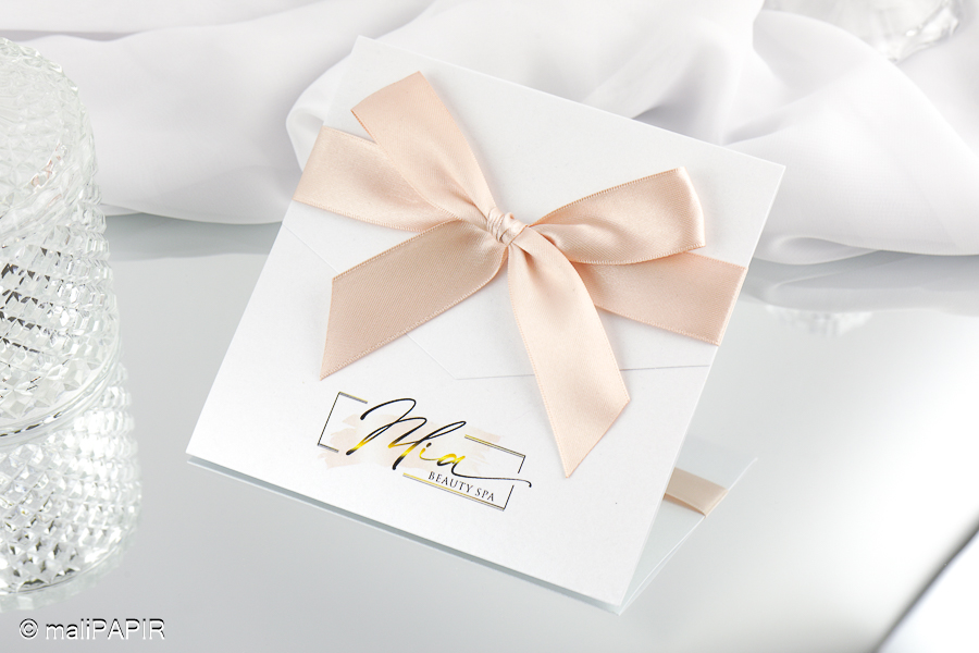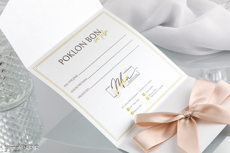 Izrađen je od premium kartona s pearl efektom, preklopnog oblika, povezan satenskom mašnom. Tisak se nalazi s unutarnje i vanjske strane.