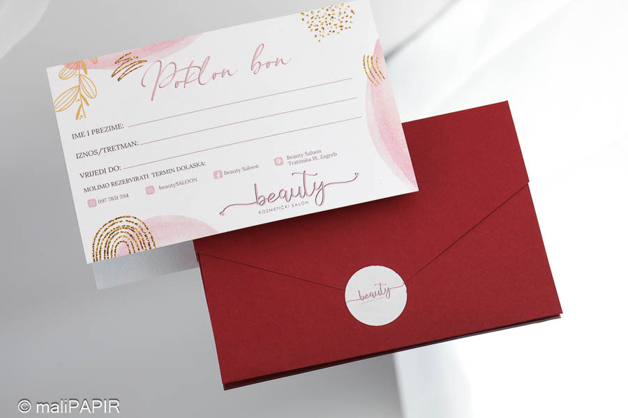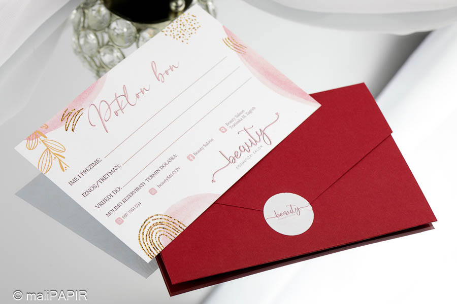Izrađen je u obliku kartice sa kuvertom. Na kartici je otisnut tekst (jednostrano), a kuverta ima utor kako bi se mogla lako zatvoriti. Uz kuverte dolaze dodatno naljepnice za čvrsto zatvaranje na kojoj je otisnut vaš logo ili poruka po želji.