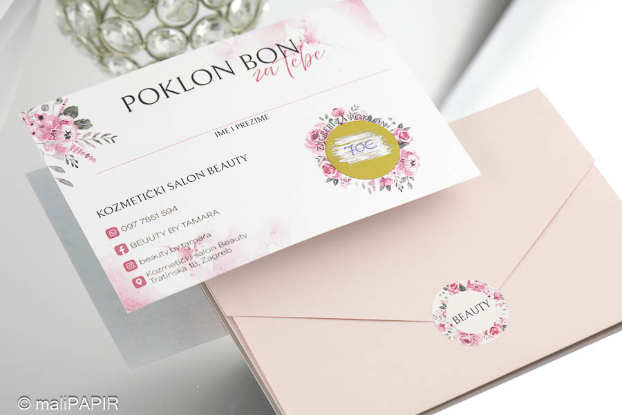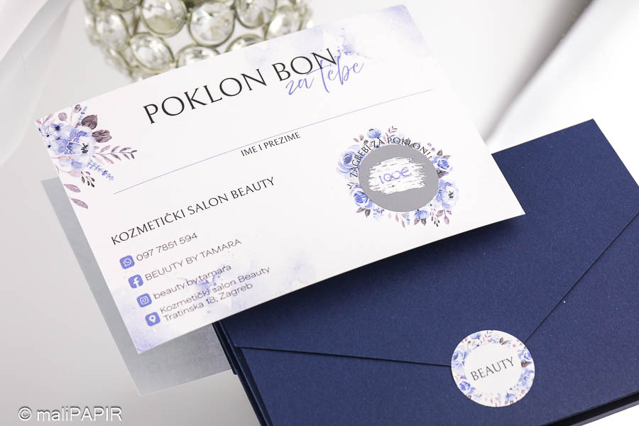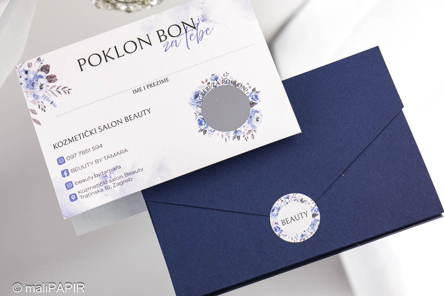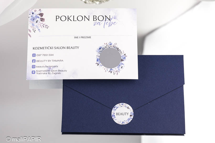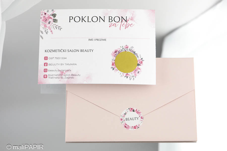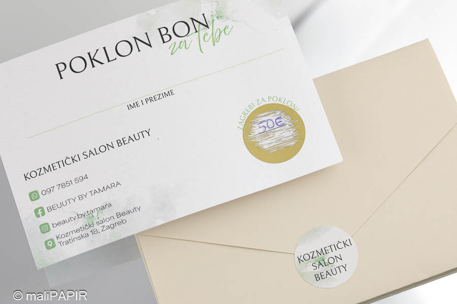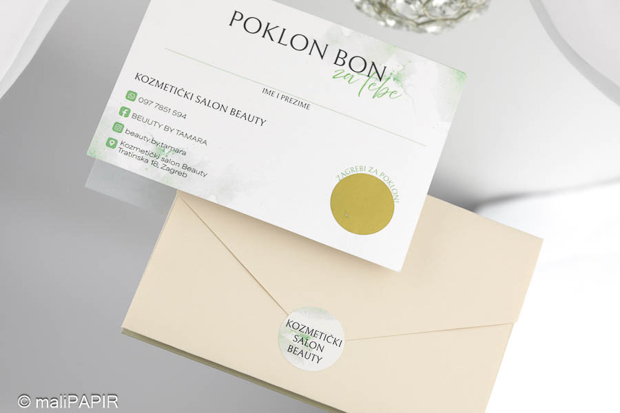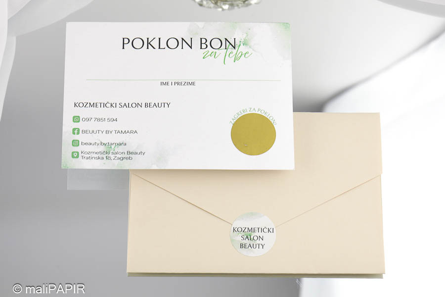 Izrađen je u obliku kartice sa kuvertom. Na kartici je otisnut tekst (jednostrano) te se na njoj nalazi emulzija za struganje kojom se otkriva iznos poklon bona. Kuverta ima utor kako bi se mogla lako zatvoriti. Uz kuverte dolaze dodatno naljepnice za čvrsto zatvaranje na kojoj je otisnut vaš logo ili poruka po želji. Iznos ispod strugalice možemo upisati mi , a možete i vi sami upisati iznos po želji klijenta.
